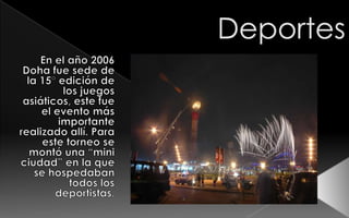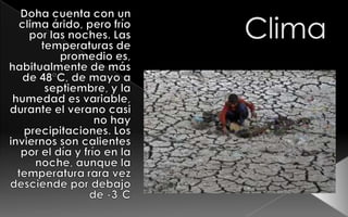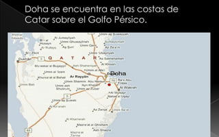 Doha es la capital y ciudad más grande de Catar. Se encuentra en la península de Catar en el Golfo Pérsico y es el centro económico y político del país, albergando las sedes de las principales empresas petroleras y de gas de Catar. A pesar de depender históricamente de la industria de hidrocarburos, el gobierno de Catar está diversificando la economía y desarrollando la ciudad de Doha a través de proyectos de construcción, educación y turismo.