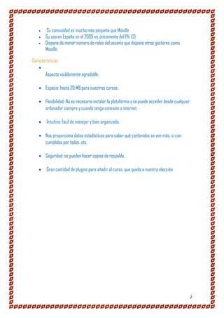 El documento describe las herramientas, ventajas y desventajas de la plataforma de aprendizaje Chamilo. Entre las herramientas se encuentran lecciones SCORM, ejercicios interactivos, videoconferencia, blogs, foros y chats. Las ventajas incluyen que es software libre, tiene una interfaz atractiva y permite videoconferencias. Las desventajas son que su comunidad es más pequeña que Moodle y en España en 2009 solo tenía el 1% de uso.