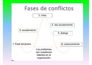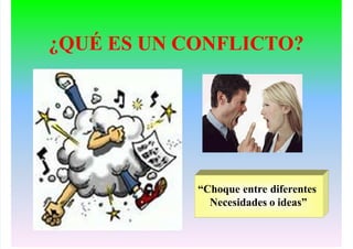 El documento proporciona información sobre el concepto de conflicto, sus causas y tipos. Explica que el conflicto surge cuando se pone en cuestión el status quo de una relación entre dos o más partes. Describe cinco estilos para manejar conflictos basados en el interés por las propias necesidades y las de los demás: evasivo, complaciente, impositivo, negociador y colaborador. El estilo colaborador, que busca satisfacer a ambas partes, es generalmente el más efectivo.