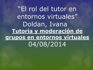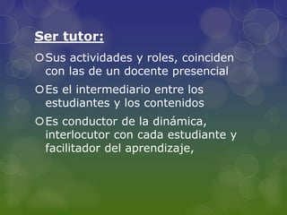 El documento describe el rol del tutor en entornos virtuales. Un tutor en entornos virtuales cumple funciones similares a un docente presencial, guiando el aprendizaje de los estudiantes, resolviendo dudas, y creando una comunidad positiva. El tutor también promueve la autonomía de los estudiantes y evita el abandono de los cursos.