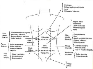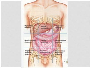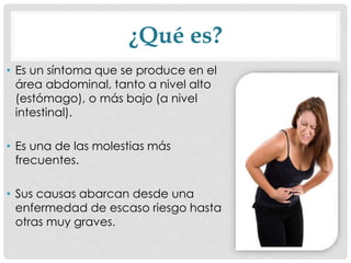 El documento describe el dolor abdominal, incluyendo su definición, causas, anatomía, fisiopatología, tipos, clasificación, enfoque diagnóstico y algunas causas comunes. Explica que el dolor abdominal puede ser visceral, somático o referido, y puede ser agudo o crónico. Detalla las causas más frecuentes de dolor abdominal agudo y crónico, y proporciona ejemplos de la semiología de algunas enfermedades como úlcera péptica, pancreatitis y apendicitis aguda.