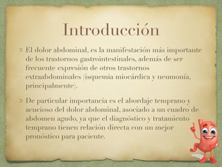 Este documento describe las causas más comunes de dolor abdominal agudo y crónico. En el dolor abdominal agudo, las causas más frecuentes incluyen apendicitis, enfermedades de la vesícula biliar y las vías biliares, gastroenteritis infecciosa, pancreatitis y enfermedad diverticular. Otras causas importantes son úlcera péptica, síndrome de intestino irritable, aneurisma de aorta abdominal, isquemia mesentérica aguda y perforación visceral. En el dolor abdominal crónico, las causas