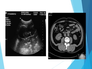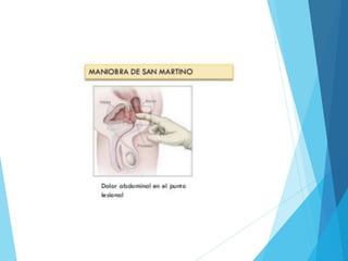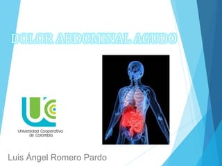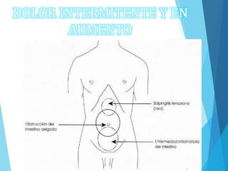 Este documento describe las causas y características clínicas de varias afecciones abdominales dolorosas, incluyendo úlcera péptica, apendicitis aguda, diverticulitis, colecistitis, pancreatitis y dolor abdominal no específico. Explica cómo el dolor abdominal puede originarse en órganos huecos, sólidos o en el peritoneo, y cómo los signos y síntomas pueden ayudar a guiar el diagnóstico de la causa subyacente. También resume los enfoques de diagnóstico y trat