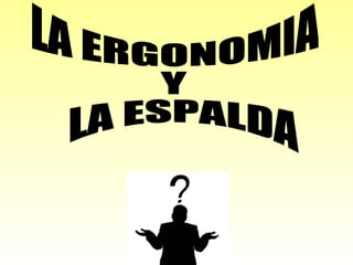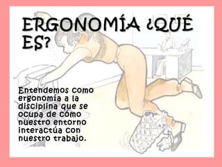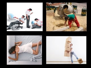 La ergonomía estudia la interacción entre el entorno laboral y los trabajadores con el fin de reducir lesiones, mejorar la productividad y calidad de vida. La biomecánica y una buena postura son importantes para prevenir dolores de espalda y otros problemas musculoesqueléticos comunes relacionados con el trabajo. Los profesionales en ergonomía ofrecen consejos como tomar descansos y levantar objetos correctamente para promover la salud de los trabajadores.