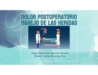 Este documento proporciona información sobre el dolor postoperatorio y su fisiopatología, así como los efectos sistémicos del dolor. Explica cómo identificar el dolor de la herida quirúrgica y los procedimientos para la anestesia de heridas superficiales, incluidos los tipos de anestésicos locales, adyuvantes y técnicas como la infiltración y bloqueo de campo. El objetivo es brindar una guía sobre el manejo adecuado del dolor postoperatorio y la anestesia de heridas.