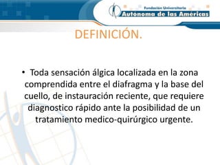 Este documento describe el dolor torácico, incluyendo su definición, etiología, tipos como el dolor isquémico, y el enfoque para evaluar y tratar a pacientes con dolor torácico agudo o no agudo. Explica el síndrome coronario agudo, su clasificación, evaluación inicial incluyendo el examen físico y electrocardiograma, y el manejo inicial en la unidad de emergencias.