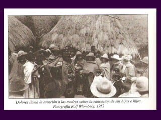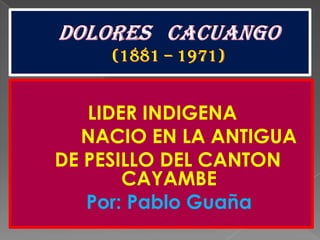 Dolores Cacuango (1881-1971) fue una líder indígena nacida en Pesillo, Cayambe, destacada por su labor en la educación y organización de campesinos. En 1944, contribuyó a la fundación de la 'fei' y fue una figura clave en el desarrollo de las primeras escuelas en la región entre 1946 y 1963. Su legado sigue presente a través del Centro de Investigación Cultural Cayambe y el Museo Cayambe.