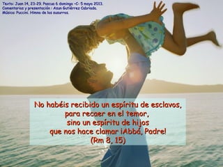 El documento habla sobre el Espíritu Santo y la paz de Jesús. Explica que el Espíritu ayuda a recordar las palabras de Jesús y actualizar su mensaje. También dice que la paz de Jesús trae alegría y armonía, y nos libera del miedo. Finalmente, pide al Espíritu Santo que guíe a las personas hacia Dios.