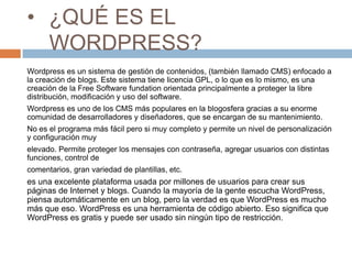 WordPress es un sistema de gestión de contenidos (CMS) popular para crear blogs y sitios web. Permite crear fácilmente blogs, páginas web, tiendas online y más. Ofrece funciones como temas personalizables, extensiones, seguridad, usuarios registrados y optimización para buscadores. El manual explica cómo instalar WordPress, administrar contenido como entradas y páginas, y configurar opciones generales.