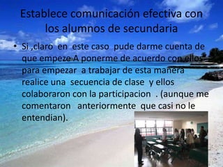 El documento describe varias estrategias y actividades de enseñanza para estudiantes de primer grado de secundaria. Incluye establecer comunicación efectiva con los estudiantes, atender a sus necesidades, aplicar estrategias metacognitivas como el trabajo en equipo, y analizar elementos como la planificación, organización, interacción y evaluación en el aprendizaje. También discute la importancia de conocer a los estudiantes y crear un contexto relevante para ellos.