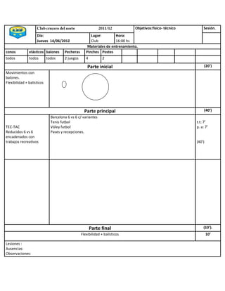 El documento presenta el plan de entrenamiento para un sesión físico-técnica que se llevará a cabo el jueves 14 de junio en el Club. La sesión consistirá en ejercicios de flexibilidad y balísticos en la parte inicial, partidos 6 contra 6 con variantes y otros ejercicios técnicos en la parte principal, y finalizará con más ejercicios de flexibilidad y balísticos.