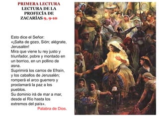 El documento contiene tres lecturas bíblicas. La primera lectura predice la llegada de un rey justo y triunfador que traerá paz. La segunda lectura habla sobre vivir guiados por el Espíritu Santo en lugar de la carne. La tercera lectura es de Jesús invitando a los cansados a acudir a él para encontrar descanso para sus almas.