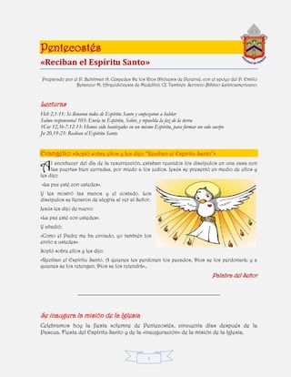 1) Jesús sopló sobre los discípulos y les dio el Espíritu Santo, marcando el inicio de la misión de la Iglesia de predicar el evangelio. 2) Pentecostés conmemora la llegada del Espíritu Santo 50 días después de la Pascua, renovando a la Iglesia con poder y dirección divina. 3) El Espíritu Santo continúa actuando hoy en día a través de personas y comunidades compromet