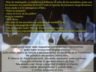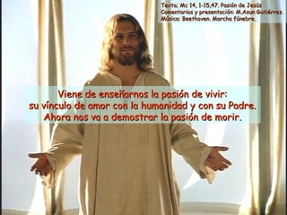 El documento resume los pasajes del Evangelio de Mc 14, 1-15, 47 que narran la Pasión de Jesús, desde su arresto hasta su crucifixión y muerte. Incluye comentarios que enfatizan cómo Jesús eligió morir en silencio y obediencia, y cómo su muerte fue el resultado de su opción por los pobres y desfavorecidos.