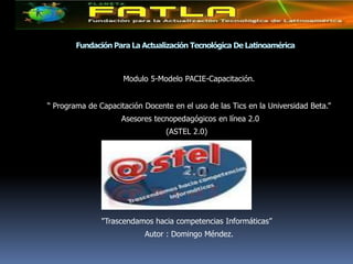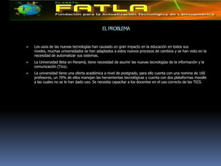 El documento propone un programa de capacitación para docentes de la Universidad Beta en Panamá en el uso de las tecnologías de la información y la comunicación (TIC). El programa se implementaría completamente en línea a través de la plataforma Moodle y constaría de cinco módulos sobre herramientas TIC, la metodología PACIE y el diseño de aulas virtuales. El objetivo es capacitar a los 160 profesores, particularmente a los 96 que aún no dominan las TIC, para aprovechar mejor las dos plataformas Moodle existentes.