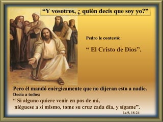 El documento resume el pasaje bíblico en el que Jesús pregunta a sus discípulos quién dicen que él es, y Pedro responde que es el Cristo de Dios. Jesús les dice que si quieren seguirlo deben negarse a sí mismos, tomar su cruz cada día y seguirlo. El seguimiento de Jesús implica itinerancia, compañía y búsqueda constante. Jesús llama a todos a seguirlo con valentía y ofreciendo la propia vida como gesto de amor a Dios.