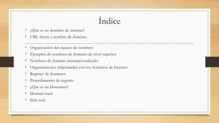 Este documento explica los conceptos básicos detrás de los dominios de internet, incluyendo lo que es un dominio, la organización del espacio de nombres, los tipos de dominios de nivel superior como .com y .org, el proceso de registro de dominios, y las organizaciones involucradas como ICANN y registradores. También cubre temas como nombres de dominio internacionalizados, normas de registro, y abusos como registrar dominios anticipadamente para subarrendarlos.