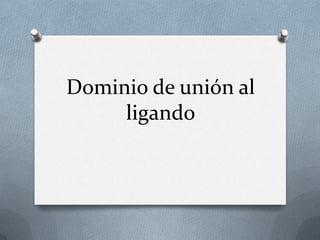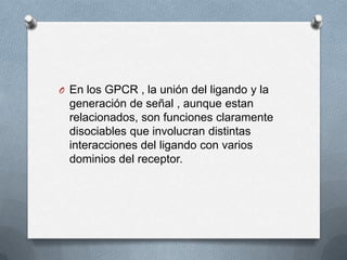 El documento describe cómo los ligandos se unen a diferentes dominios de los receptores acoplados a proteínas G (GPCR) para activarlos y generar señales, y cómo estas regiones de unión varían dependiendo de la subfamilia del receptor y la estructura del ligando. En particular, la activación requiere la interacción del dominio NH2-terminal del ligando con la membrana asociada al dominio del receptor, y este dominio NH2-terminal junto con bucles extracelulares son cruciales para permitir la activación de vías de señalización medi