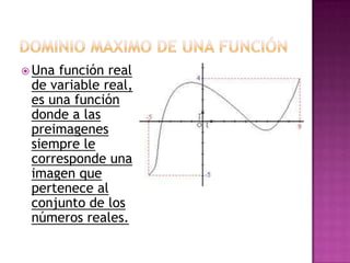 Este documento discute las propiedades de las funciones reales. Explica que en una función real, cada valor del dominio debe corresponder a un único valor en el conjunto de los números reales. También analiza cómo determinar el dominio máximo de una función basado en si esta está bien definida. Finalmente, presenta ejemplos para ilustrar que la división entre cero y la raíz cuadrada de un número negativo no están definidas.