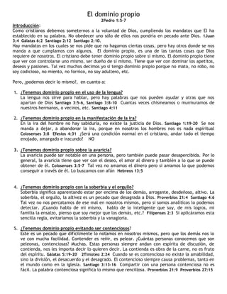 El documento habla sobre la importancia del dominio propio para los cristianos. Menciona varias áreas en las que se debe ejercer dominio propio como el uso de la lengua, la manifestación de la ira, la avaricia, la soberbia y el orgullo, siendo contencioso, siendo amable con los hermanos y evitando la envidia. Exhorta a los cristianos a practicar el dominio propio no solo en estas áreas sino también en otros como la maledicencia, el juzgar a la ligera y el rencor.