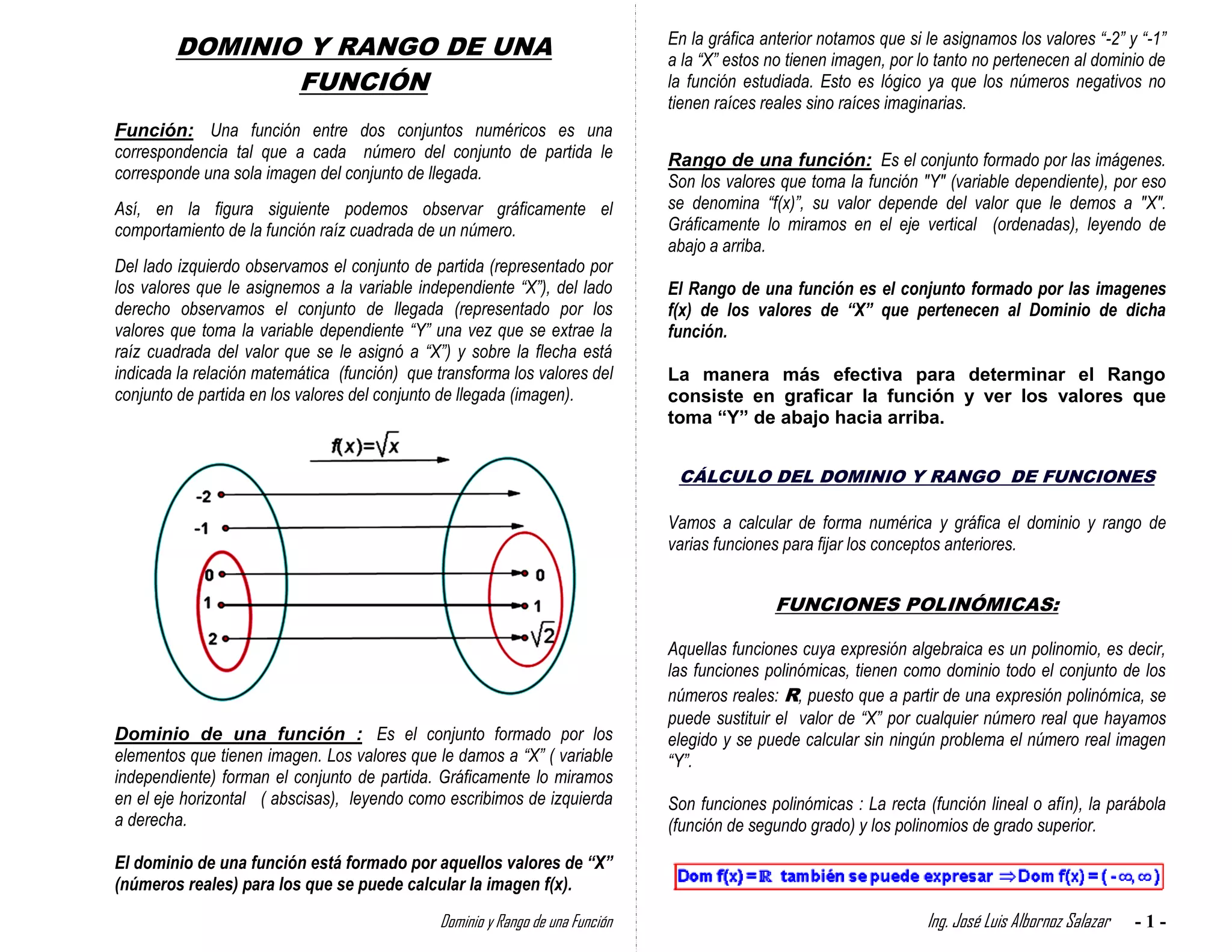 Este documento explica los conceptos de dominio y rango de una función. Define dominio como el conjunto de valores que tienen imagen y rango como el conjunto formado por las imágenes. Explica cómo calcular el dominio y rango de diferentes tipos de funciones como polinómicas, racionales, irracionales, exponenciales y logarítmicas mediante ejemplos numéricos y gráficos. Resuelve 14 ejercicios paso a paso para ilustrar el cálculo del dominio y rango en cada caso.