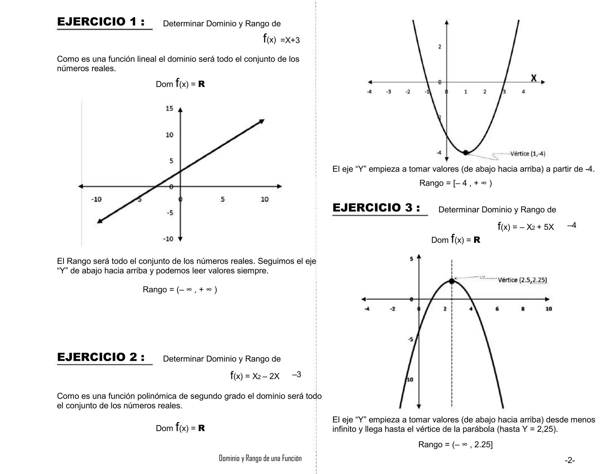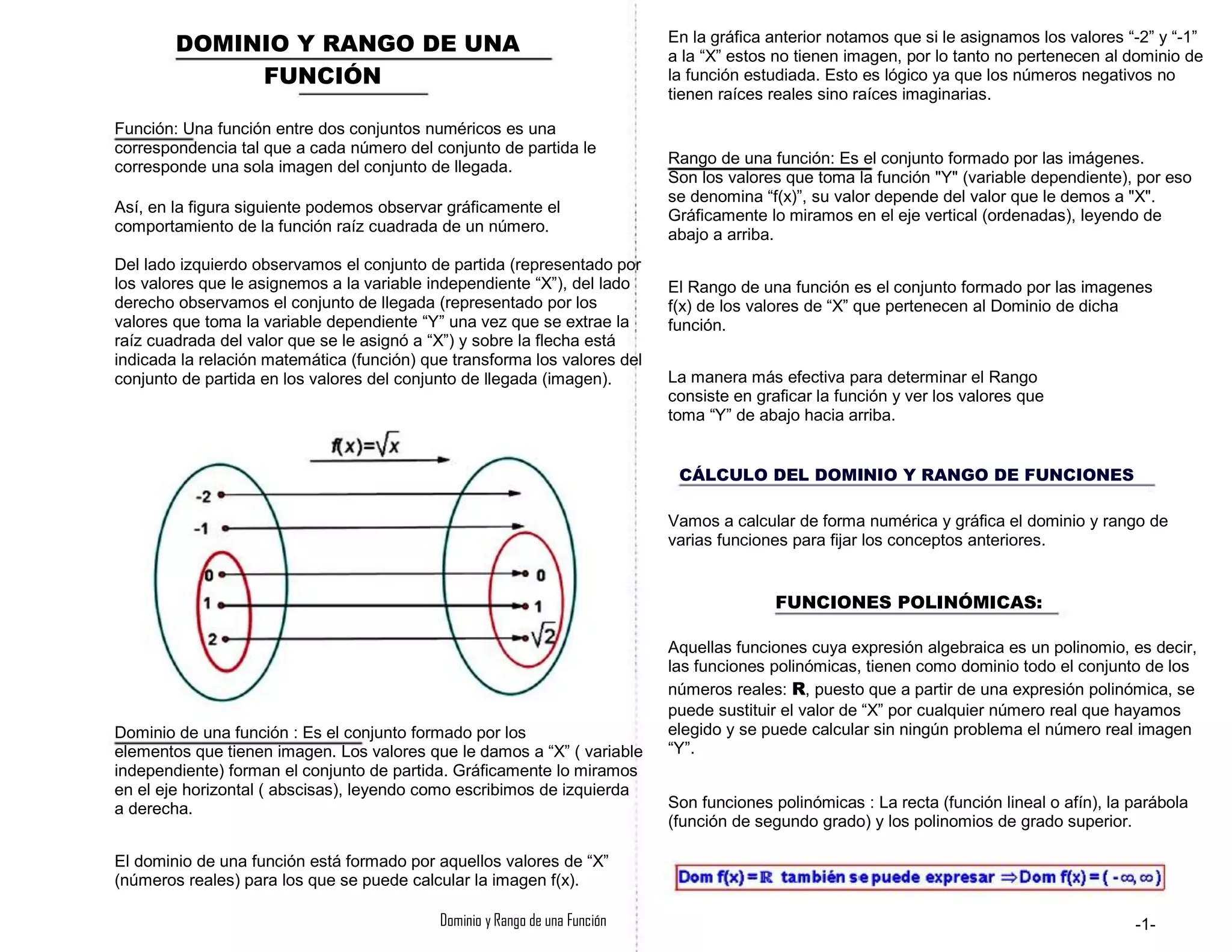 Este documento explica los conceptos de dominio y rango de una función. Define dominio como el conjunto de valores de la variable independiente que tienen imagen, y rango como el conjunto de valores que toma la variable dependiente. Explica cómo calcular dominio y rango de diferentes tipos de funciones como polinómicas, racionales, irracionales y exponenciales. Incluye ejemplos numéricos y gráficos para ilustrar los conceptos.