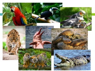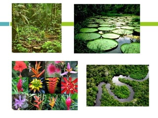 Este documento describe el Dominio Amazónico biogeográfico, incluyendo sus principales provincias. Abarca gran parte de Sudamérica y se caracteriza por abundantes especies tropicales y una gran diversidad de selvas, bosques y sabanas. Dentro de este dominio, la Provincia Amazónica se ubica principalmente en el norte de Brasil y contiene exuberantes selvas húmedas con una enorme variedad de plantas y animales. Otra provincia importante es la de las Yungas, localizada en los Andes del noroeste de Argentina y sur