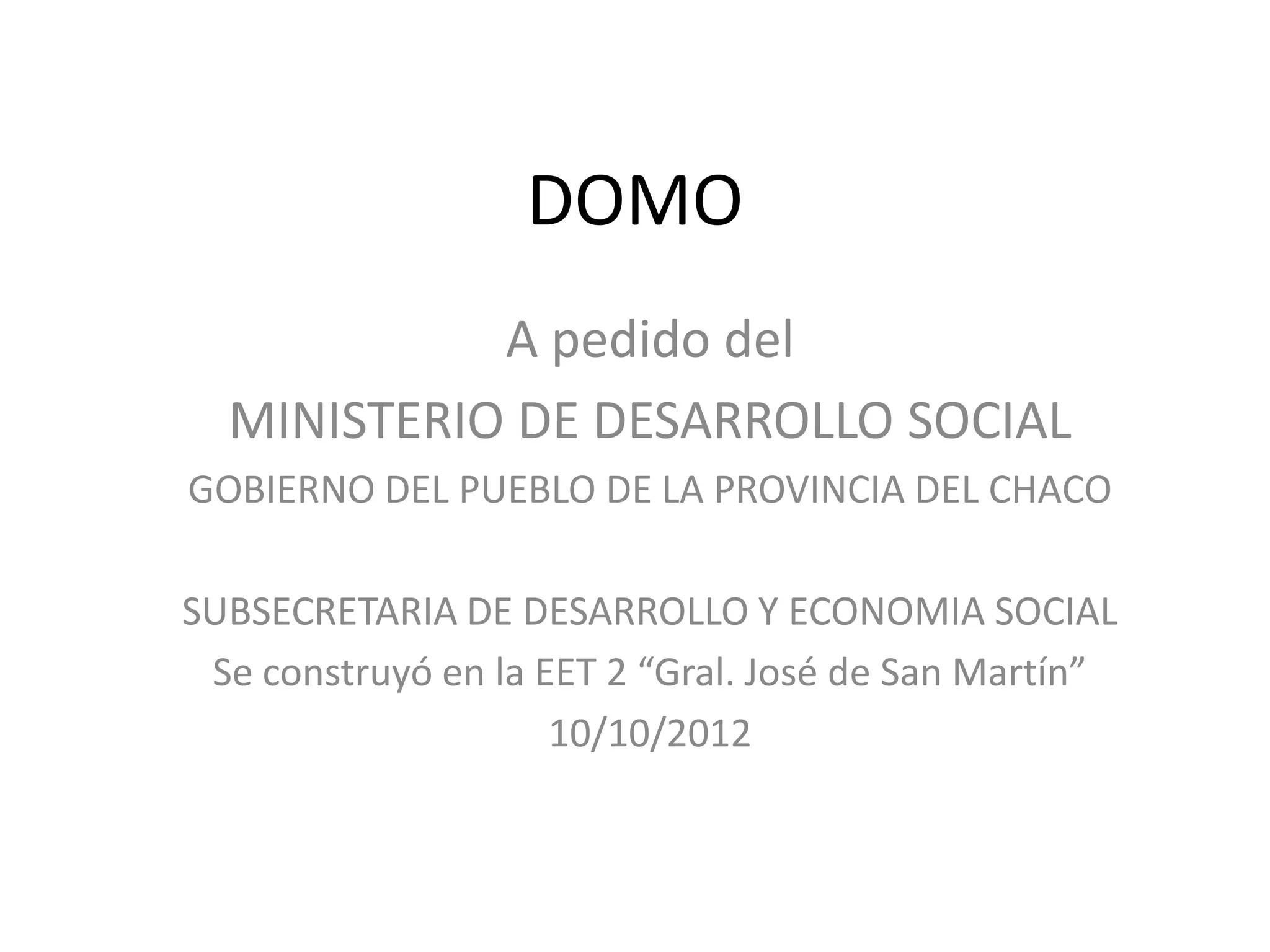 El documento es un certificado que indica que el Ministerio de Desarrollo Social de la provincia del Chaco construyó un DOMO en la Escuela de Educación Técnica 2 "General José de San Martín" el 10 de octubre de 2012.