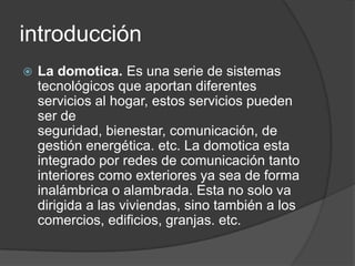 El documento proporciona una introducción a la domótica, describiendo sus aplicaciones principales como el ahorro energético, el confort, la seguridad, las comunicaciones, la accesibilidad y los sistemas empleados. Explica conceptos clave como los sensores, actuadores, arquitecturas y estándares de redes domésticas e incluye una conclusión sobre los retos futuros de la domótica.