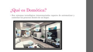El documento describe la domótica, que son sistemas tecnológicos interconectados para automatizar y controlar procesos en el hogar. Ofrece ventajas como seguridad mediante sensores, ahorro de energía al controlar dispositivos, y comodidad controlando elementos de forma remota. Explica dispositivos como sensores, controladores, medios de transmisión y actuadores, así como arquitecturas centralizadas, distribuidas y mixtas. Finalmente, distingue entre sistemas cableados, inalámbricos y mixtos.