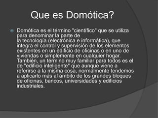 El documento describe los conceptos básicos de la domótica, incluyendo que es un sistema inteligente para controlar y supervisar elementos en edificios como oficinas o viviendas. Explica que los sistemas pueden ser centralizados o descentralizados, y describe algunos sistemas domóticos comunes como iluminación, climatización, persianas y seguridad. También cubre los grados de inteligencia de los sistemas y los beneficios de confort y seguridad que proporciona la domótica.