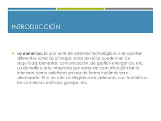El documento habla sobre la domótica, que son sistemas tecnológicos que aportan servicios al hogar como seguridad, confort y ahorro energético. Estos sistemas están compuestos por redes de comunicación, sensores, actuadores y una central de gestión. La domótica puede agruparse en cinco ámbitos principales: ahorro energético, confort, seguridad, comunicaciones y accesibilidad.