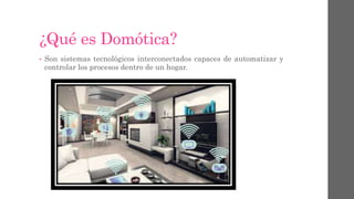 El documento describe la domótica, que son sistemas tecnológicos interconectados para automatizar y controlar procesos en el hogar. Ofrece ventajas como seguridad (sensores), ahorro energético (control de electrodomésticos) y confort (control remoto de dispositivos). Se detallan dispositivos como sensores, controladores, medios de transmisión y actuadores, así como tecnologías como Instabus EIB, Lonworks y X10. Finalmente, explica arquitecturas centralizadas, distribuidas y mixtas, y sistem