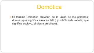 La domótica involucra la automatización del hogar mediante sensores, unidades de control y actuadores para mejorar el confort, ahorro energético y seguridad. Los sensores monitorean factores ambientales, la unidad de control procesa la información y los actuadores modifican el estado de equipos. Esto permite controlar iluminación, climatización y otros sistemas de forma remota para aumentar la calidad de vida.