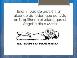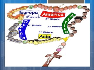 Este documento habla sobre el Santo Rosario y sus elementos. Explica que el Rosario es una forma de oración accesible a todos que consiste en repetir el saludo del ángel a María. También menciona que el Rosario Misionero fue ideado por Monseñor Fulton Sheen en el siglo XX para apoyar las misiones católicas en África, América, Europa, Oceanía y Asia.