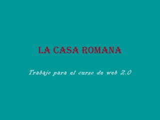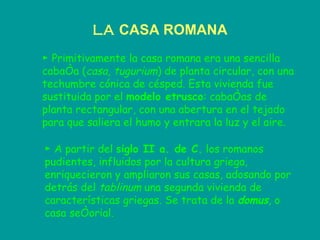 La casa romana primitiva era una cabaña circular de césped, pero luego adoptó un diseño rectangular etrusco. A partir del siglo II a.C., las casas de los ricos romanos se hicieron más grandes y lujosas, con la introducción de la domus de estilo griego, que incluía un atrio central, tablinum y peristilo. Sin embargo, la mayoría de los romanos vivían apiñados en insulae de alquiler de mala calidad.
