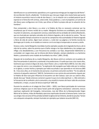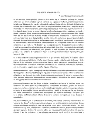 El documento describe cómo Don Bosco era un hombre bíblico. Señala que su vida y obra reflejaban características de personas en la Biblia como su apertura al conocimiento de Dios y los demás, su enfoque en la justicia y solidaridad, y su visión del ser humano como un ser en camino. También describe cómo Don Bosco desarrolló un amor por la Palabra de Dios a través de las enseñanzas de su madre y su participación en actividades religiosas durante su juventud.