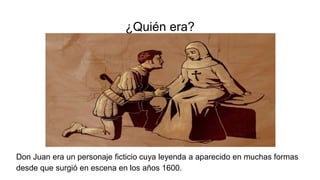 Este documento resume la figura de Don Juan, un personaje ficticio cuya leyenda ha aparecido en muchas obras desde el siglo XVII. Explora cómo diferentes autores han retratado a Don Juan, ya sea como un seductor patológico, una figura satánica o el arquetipo del seductor insatisfecho. También discute cómo Tirso de Molina y Zorrilla representaron versiones diferentes de Don Juan en sus obras, y cómo el personaje también ha aparecido en la ópera y el cine.