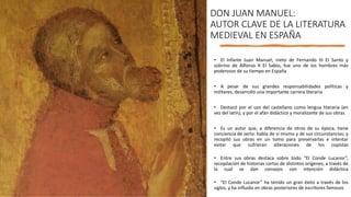 Este documento resume la vida y obra del autor medieval español Don Juan Manuel. Fue nieto de Fernando III y sobrino de Alfonso X, y destacó por escribir en castellano en lugar de latín con un afán didáctico y moralizante. Su obra principal fue El Conde Lucanor, una recopilación de cuentos cortos con moraleja para educar a la nobleza. El documento describe la biografía, obras y legado literario de este autor clave de la literatura medieval española.
