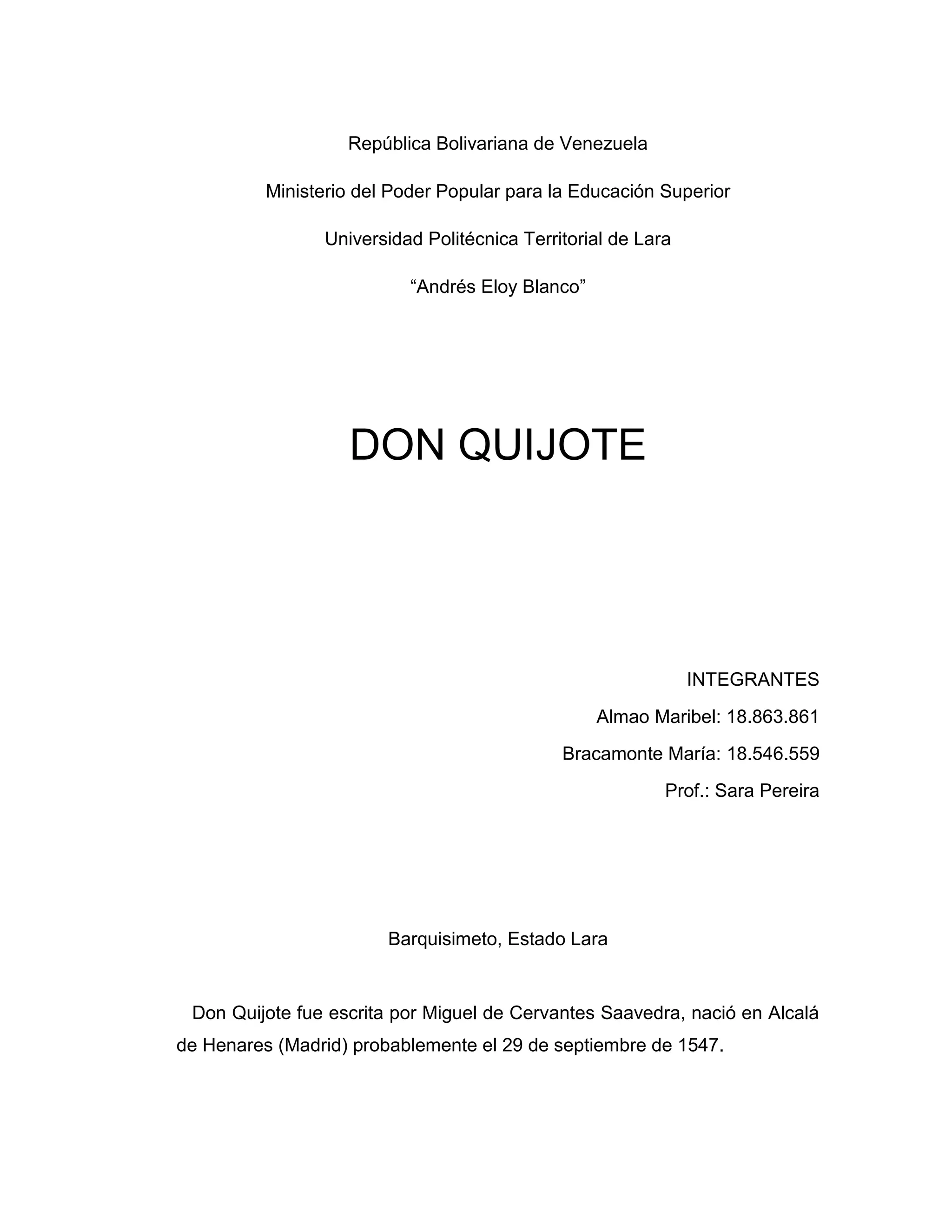 El documento resume brevemente la obra Don Quijote de la Mancha de Miguel de Cervantes. Explica que la obra se publicó en dos partes en 1605 y 1615 y que a través de ella, Cervantes ridiculizó las novelas caballerescas de la época. También describe la historia como un conjunto de hechos pasados y define conceptos como sociedad, cultura, literatura, antropología, geografía y geopolítica.