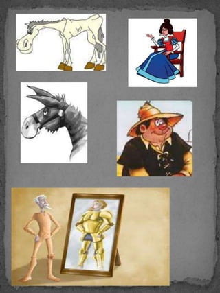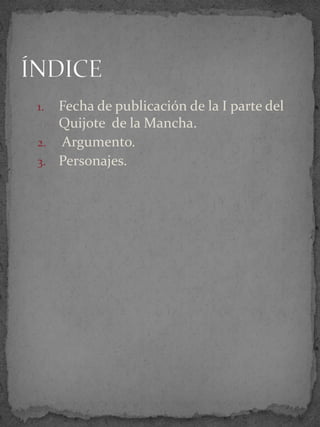 El documento resume las dos partes de la novela Don Quijote de la Mancha de Miguel de Cervantes. La primera parte, publicada en 1605, presenta a Don Quijote, un hidalgo que decide convertirse en caballero andante después de leer muchos libros de caballería. Acompañado de su escudero Sancho Panza, Don Quijote tiene varias aventuras imaginarias. La segunda parte, publicada en 1615, continúa las aventuras de Don Quijote luego de que es derrotado por el bachiller Sansón Carrasco.