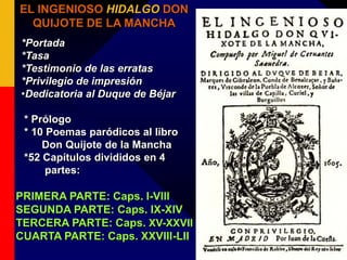 El documento resume las dos partes del Quijote de Miguel de Cervantes. La primera parte publicada en 1605 consta de 52 capítulos divididos en cuatro partes y narra las primeras aventuras de Don Quijote y Sancho Panza. La segunda parte publicada en 1615 tiene 74 capítulos y continúa las aventuras de los personajes, con Don Quijote emprendiendo tres salidas de su aldea.