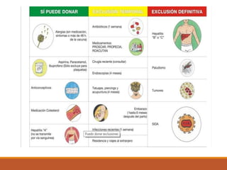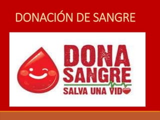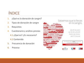 El documento describe el proceso de donación de sangre, incluyendo los tipos de donación, requisitos, cuestionario y análisis previos, y el proceso de extracción. La donación de sangre es un acto voluntario y seguro para ayudar a personas que la necesitan. Antes de la donación se realiza un cuestionario y análisis médico para garantizar la seguridad del donante y receptor. El proceso completo dura aproximadamente 20 minutos y permite donar hasta 4 veces al año para los hombres y 3 para las mujeres.