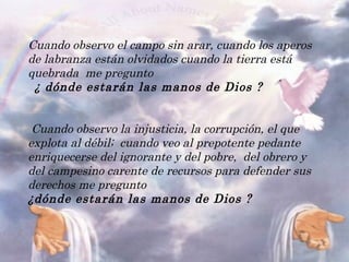 El documento reflexiona sobre la ausencia de Dios ante la injusticia, el sufrimiento y la pobreza en el mundo. Plantea que las manos de Dios somos los seres humanos, quienes debemos luchar por la justicia y ayudar a los más necesitados. Al final, comprende que debe usar sus propias manos para amar y compartir, y así contribuir a forjar un mundo mejor.