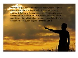 El documento enseña que todos los creyentes tienen diferentes dones espirituales según la gracia de Dios y deben usar esos dones para servir a los demás y edificar al cuerpo de Cristo.