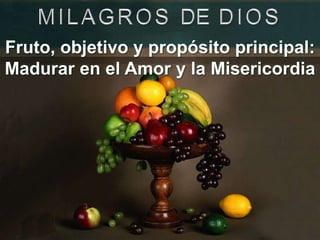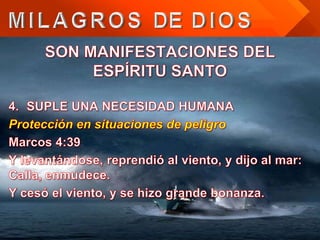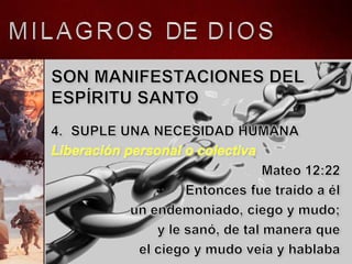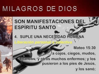 Este documento presenta información sobre la fe, la fidelidad, los milagros, la salud y la sanidad. También discute cómo los milagros son manifestaciones del Espíritu Santo que confirman la Palabra de Dios, suplen necesidades humanas y cumplen propósitos de Dios. Dios espera arrepentimiento, crecimiento de la fe y edificación en amor como respuesta a Sus milagros.