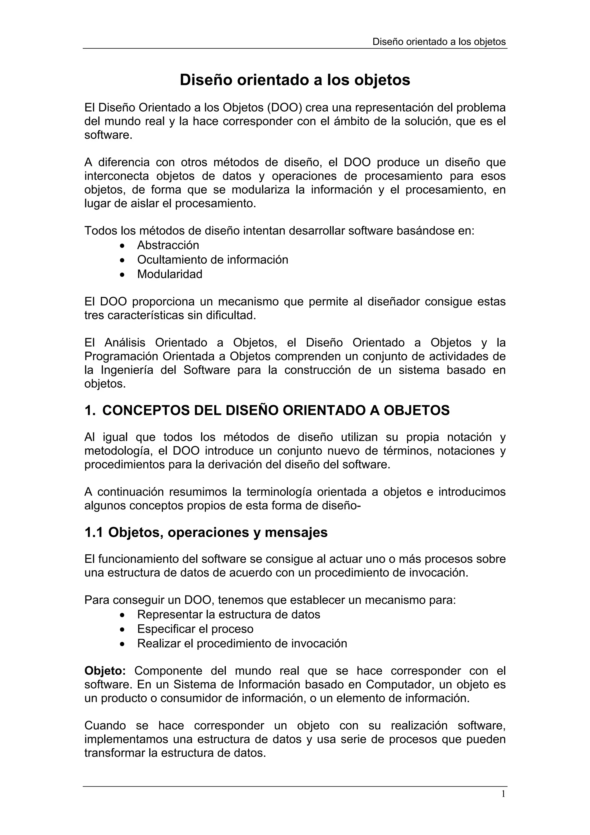 Este documento describe los conceptos fundamentales del diseño orientado a objetos. En primer lugar, explica que el DOO crea una representación del problema del mundo real en forma de objetos de software. Luego, resume los principales pasos del DOO, que incluyen identificar los objetos y sus atributos, establecer las interfaces entre objetos, y organizar las relases entre clases mediante herencia. Finalmente, el documento proporciona un ejemplo detallado de cómo aplicar estos pasos para diseñar un sistema de procesamiento de texto sencillo.
