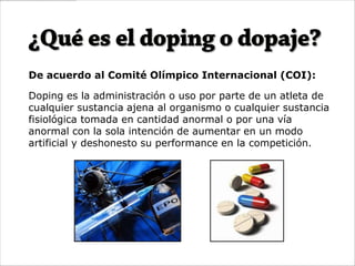 El documento define el doping como el uso de sustancias o métodos prohibidos para mejorar el rendimiento deportivo de forma artificial. Explica que históricamente los atletas han recurrido a diversas sustancias como la cafeína, hongos alucinógenos y hojas de coca. Para combatir el doping, el COI clasifica las sustancias prohibidas y promueve la prevención, control y rehabilitación de deportistas.
