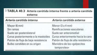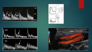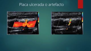 El documento aborda la evaluación y diagnóstico de la estenosis carotídea y vertebral, incluyendo métodos de ultrasonido y parámetros críticos para determinar la gravedad de las estenosis. Se destaca la importancia del flujo sanguíneo, características de las placas y diversas consideraciones clínicas asociadas a los pacientes. También se discuten las implicaciones del secuestro subclavio y la clasificación de oclusiones en la arteria carótida interna (ACI) y arteria carótida común (ACC).