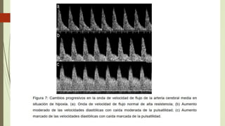 El documento detalla las técnicas y parámetros utilizados en el doppler obstétrico, incluyendo la evaluación de arterias como la umbilical y cerebral media, además de explicar las indicaciones clínicas para su uso en diversas patologías maternas y fetales. Se discuten aspectos técnicos de medición y parámetros relevantes como el índice de pulsatilidad para detectar complicaciones como la hipoxia fetal y preeclampsia. La metodología se centra en asegurar medidas precisas y la correcta identificación de vasos utilizando diferentes enfoques y escalas de velocidad.
